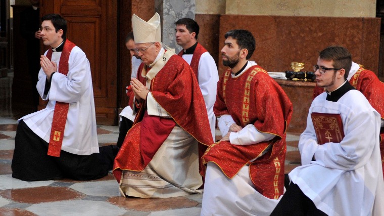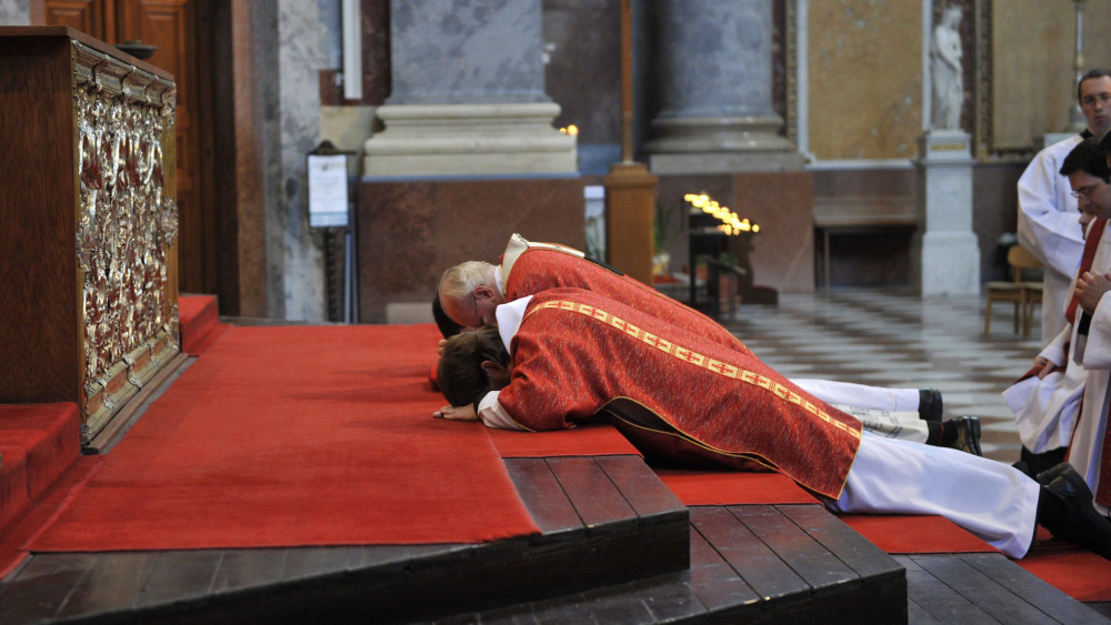 A pap földre borulása: az önmagát kiüresítő, az emberrel, a földdel azonosuló Krisztust jeleníti meg. Az oltár most maga a Golgota: lélekben odamegyünk a Golgotához, Jézus keresztjéhez.