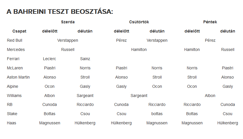 Szerdán Bahreinben kezdetét veszi a három napon át tartó előszezoni teszt, melyen előreláthatóan a 10 istálló 20 aktív versenyzője vesz csak részt.