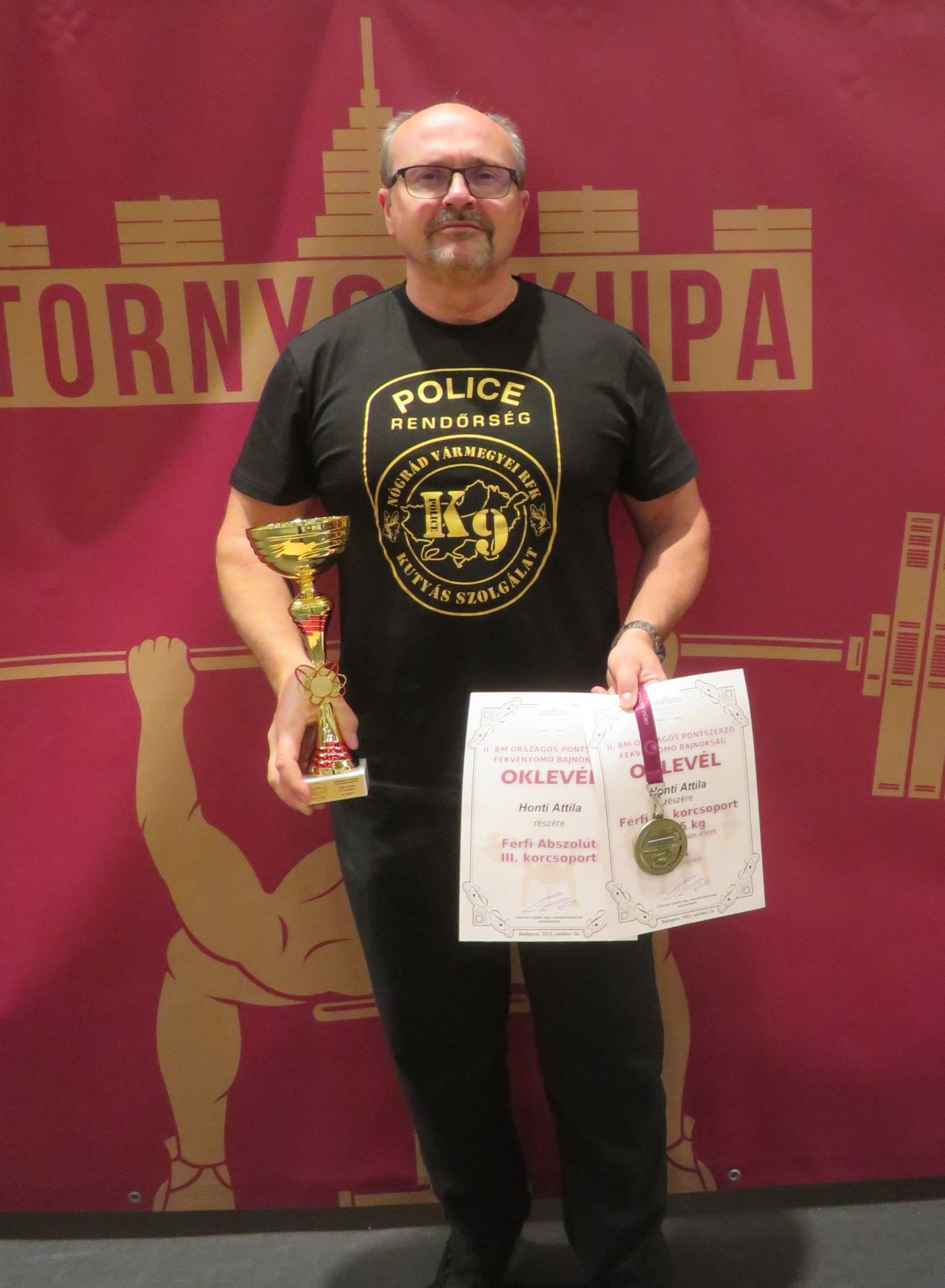 A Nógrád Vármegyei Rendőr-főkapitányság munkatársa a fekvenyomó bajnokságon az aranyérem mellett a III. korcsoportban is megszerezte az abszolút bajnoki címet.
