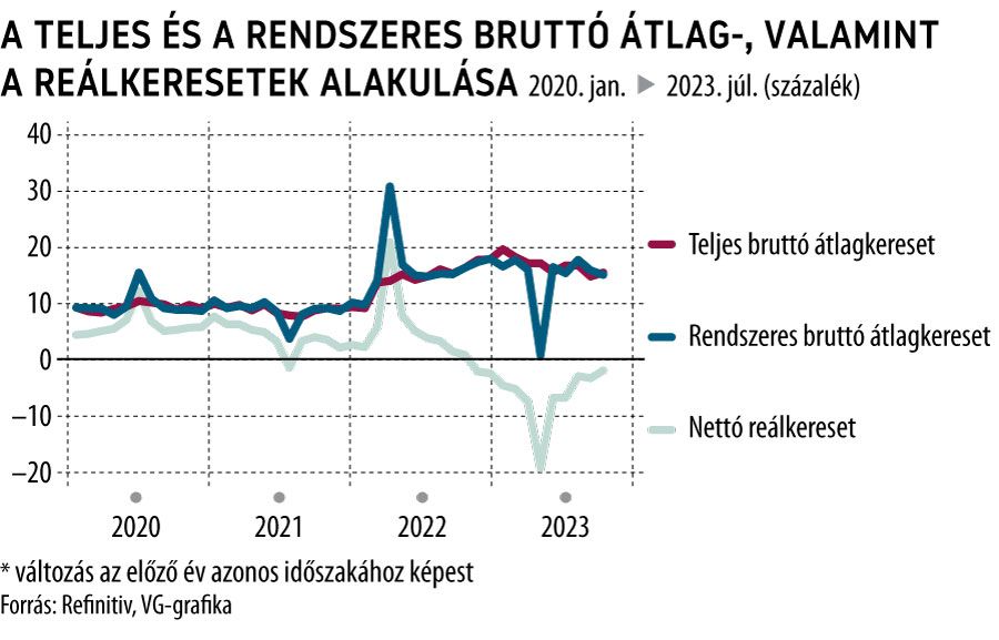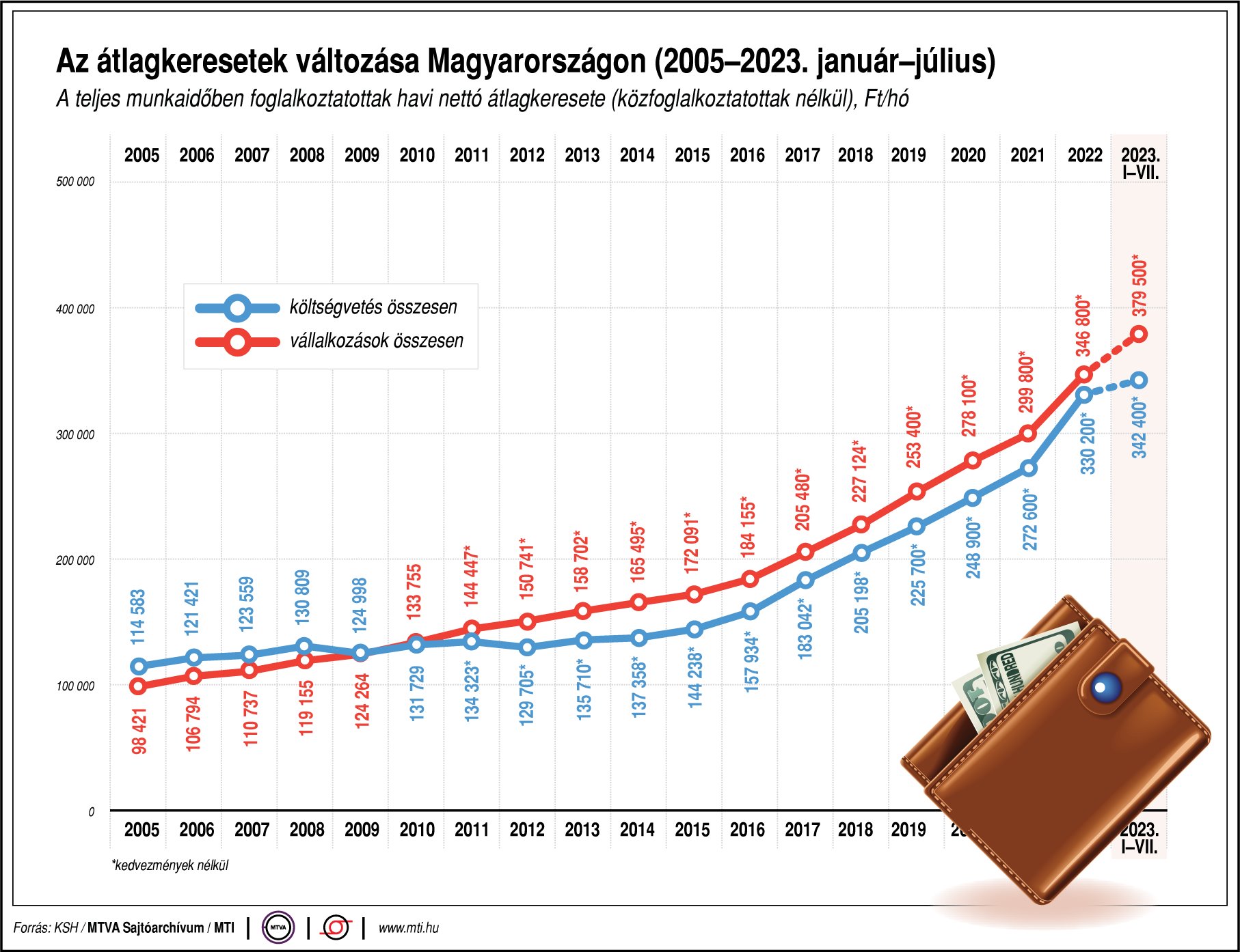 A Központi Statisztikai Hivatal adatai szerint 2023 júliusában 559 100 forintra emelkedett a bruttó átlagkereset, így egy év alatt 74 ezer forinttal, azaz 15,2 százalékkal nőtt az átlagbér emelte ki a legfrissebb statisztikai jelentéshez.