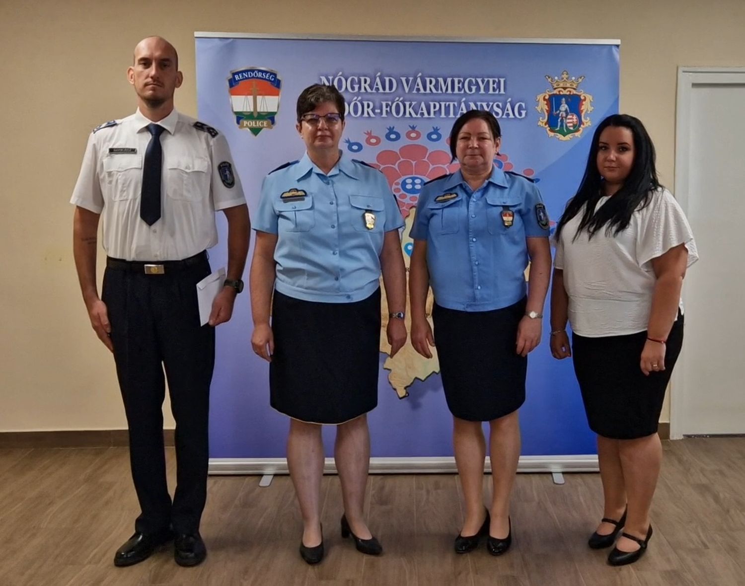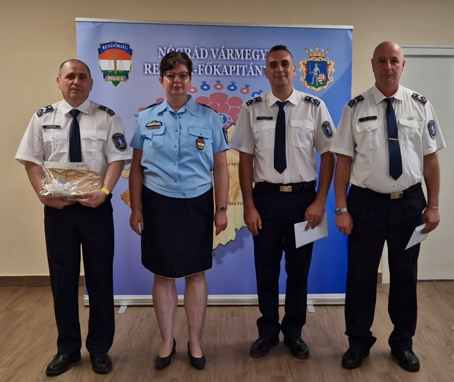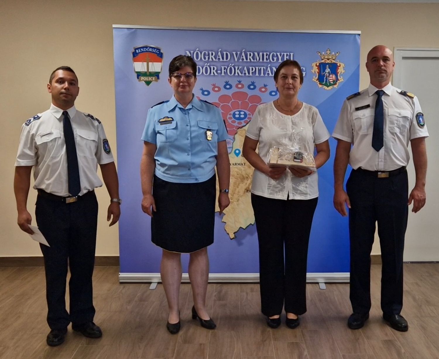 A Nógrád Vármegyei Rendőr-főkapitányság vezetője augusztus 20-a alkalmából, szakterületén nyújtott eredményes munkája elismeréseként dicséretben és jutalomban részesítette Almádiné Gáspár Edina üzemeltetési segédelőadót, a Gazdasági Igazgatóság Műszaki Osztály munkatársát, Bóka István címzetes rendőr főtörzszászlóst, a Salgótarjáni Rendőrkapitányság Közrendvédelmi és Határrendészeti Osztály Körzeti Megbízotti Alosztály körzeti megbízottját, Takács Marianna ügyviteli segédelőadót, a Balassagyarmati Rendőrkapitányság Rendészeti Osztály Igazgatásrendészeti Alosztály munkatársát, továbbá Murányi Andreát, a Rétsági Rendőrkapitányság Rendészeti Osztály Előkészítő Csoport ügyviteli segédelőadóját, és Hugyecz János címzetes rendőr főtörzszászlóst, a Szécsényi Rendőrkapitányság Bűnügyi Osztály Nyomozó alosztály nyomozóját.