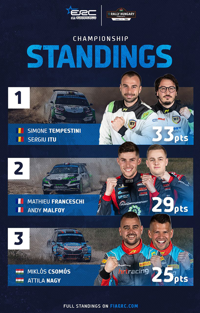 Negyedik szakaszgyőzelmét aratta a Rally Hungary-n Mathieu Franceschi, aki tegnapi remek formáját mára is átmentette, aminek köszönhetően már negyedik az összetettben. Mi lett volna, ha tegnap nem borul fel? Szerencsére négy kerékre esett, és folytatta, de veszített egy percet emiatt. Az összetettben továbbra is Martins Sesks vezet, Csomós Mixi az ötödik helyről várja az utolsó két szakaszt.