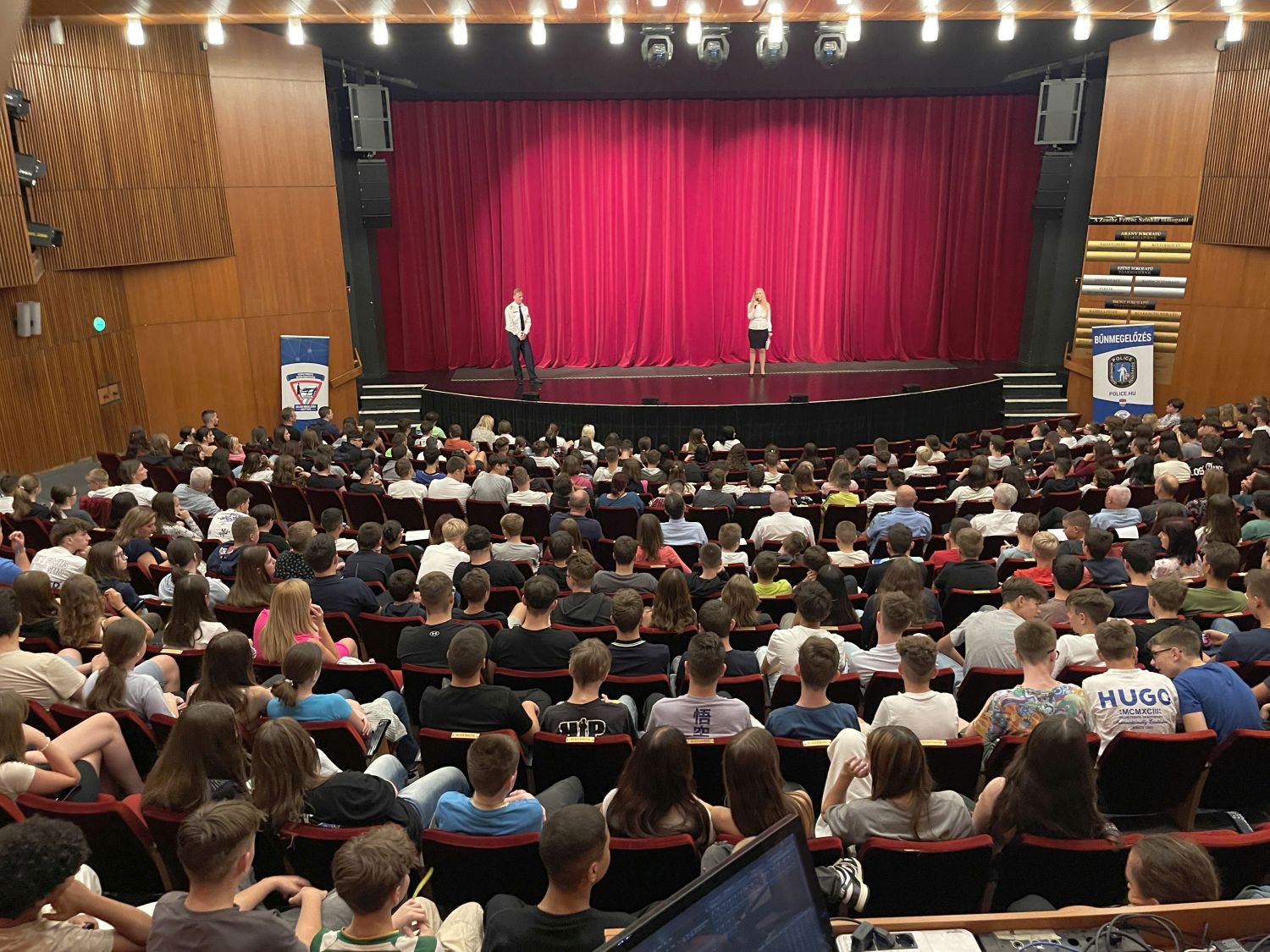 Az előadást megelőzően a diákokat már a művelődési központ üvegcsarnokában prevenciós szakemberek várták, akiktől bűn és baleset-megelőzési szóróanyagokat és a láthatóságot elősegítő eszközöket vehettek át.