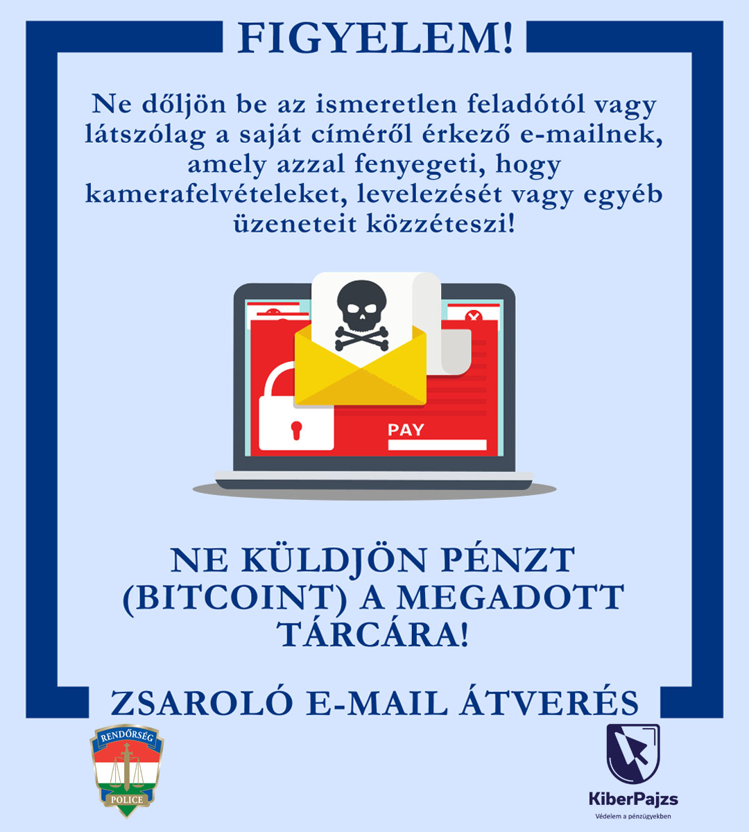 - Ha ilyen üzenet érkezik postafiókjába, semmiképpen ne tegyen eleget az elkövetők követelésének! A fenyegetés ellenére a feladó nem rendelkezik személyes adataival, az e-mailt tömegesen, címlisták alkalmazásával – és nem egyedileg, célzottan – küldik ki, bízva abban, hogy minél többen megijednek az üres fenyegetéstől.
