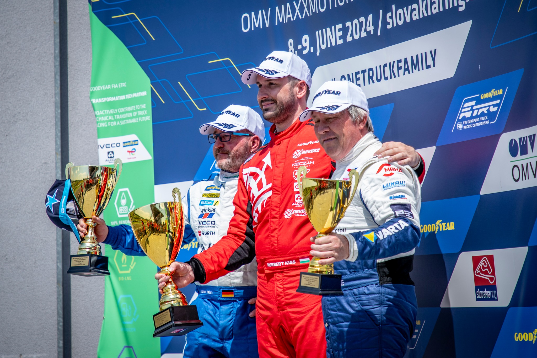 Az első rajtkockát nagy csatában megszerezte, majd mindkét futamot megnyerte a címvédő és ötszörös Európa-bajnok Kiss Norbert, a Révész Racing versenyzője a gyorsasági kamion Eb idei második, Slovakiaringen.