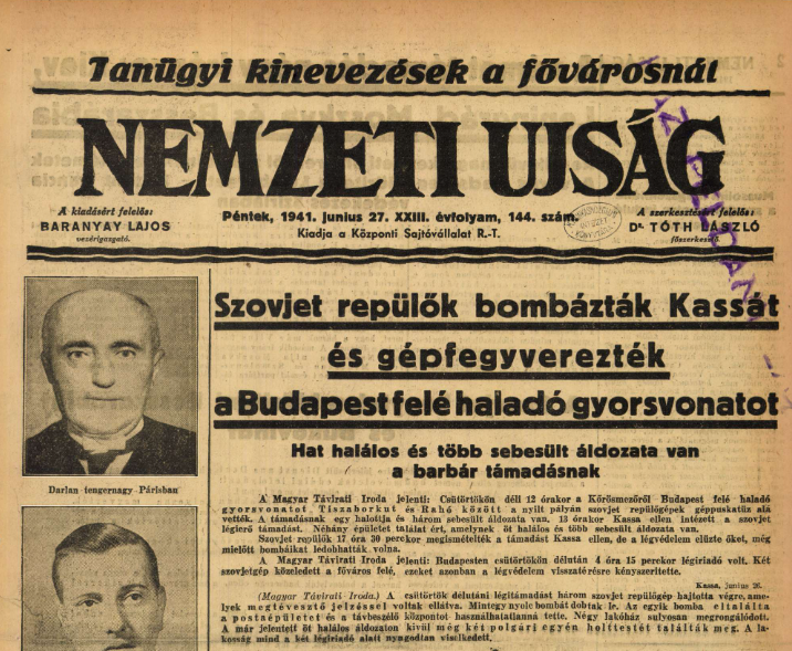1941. június 26-án azonosítatlan repülőgépek bombázták Kassa városát, mely támadás során 29 ledobott bomba összesen 32 ember életét oltotta ki, és további 80 főt sebesített meg. A pusztító akciót a Bárdossy-kormány a Szovjetunió agressziójának minősítette és válaszul ellencsapást indított, a kassai bombázás ezáltal döntő módon járult hozzá Magyarország világháborús hadba lépéséhez.