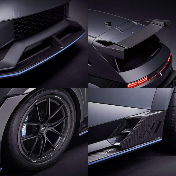 Természetesen a Hyundai Ioniq 5 N villanyautónál is megadja a lehetőséget a gyár az autó megjelenésének további fokozására, az NXP1 nevű tanulmány mutatja, hogy mire számíthatunk. Nem csak a légterelőket (első koptató, küszöbborítások, diffúzor, tetőspoiler) készítik karbonból, de jut a szénszál erősítésű műanyagból a felnikre is.