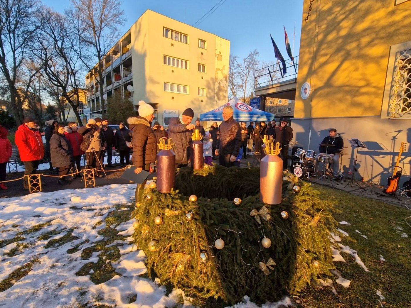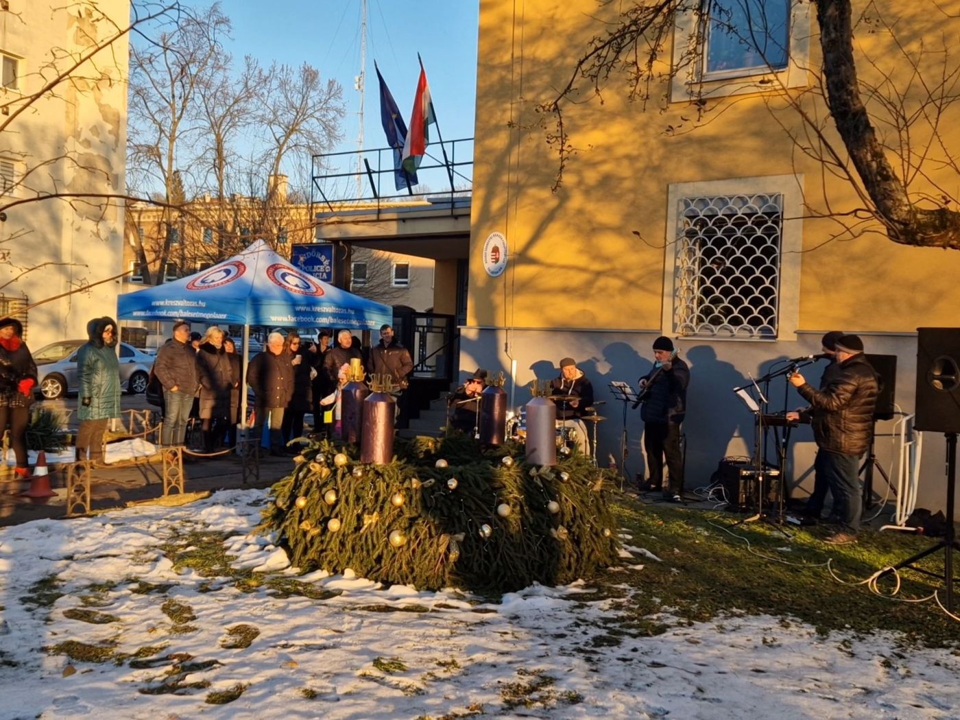A Nógrád Vármegyei Rendőr-főkapitányság épülete előtt elhelyezett adventi koszorút hagyományteremtő módon ebben az évben is rendőrök és civilek közösen állták körbe advent első vasárnapján, hogy közös gyertyagyújtással kezdjék meg az adventi időszakot és a szeretet ünnepére hangolódást. A munkatársaink által elkészített és feldíszített koszorú a karácsonyi időszakban évek óta a rendőr-főkapitányság ékessége.