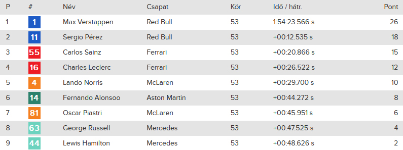 A címvédő Szuzukában zsinórban a harmadik, míg teljes pályafutását tekintve az 57. győzelmét aratta. A harmadik-negyedik helyen befutó Scuderia párosát tehát Norris követte, majd Alonso, az utolsó körben előző Russell, Piastri, Hamilton, illetve a hazai közönség előtt versenyző Cunoda zárta a pontszerzők sorát.