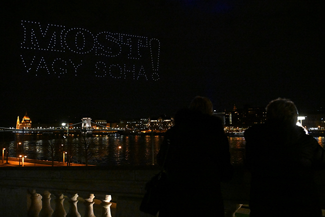 Az alkotó szerint ők így lepték meg a budapestieket, 500 drónnal: Ma este 18.48-kor megleptük a budapestieket. A Lánchíd mellett felszállt 500 drón, hogy égre rajzolja március 15. ünnepi üzenetét. A MOST VAGY SOHA alkotói így emlékeznek Petőfi Sándorra és a hősökre. Holnap látványos videón mutatom meg, hogy sikerült!