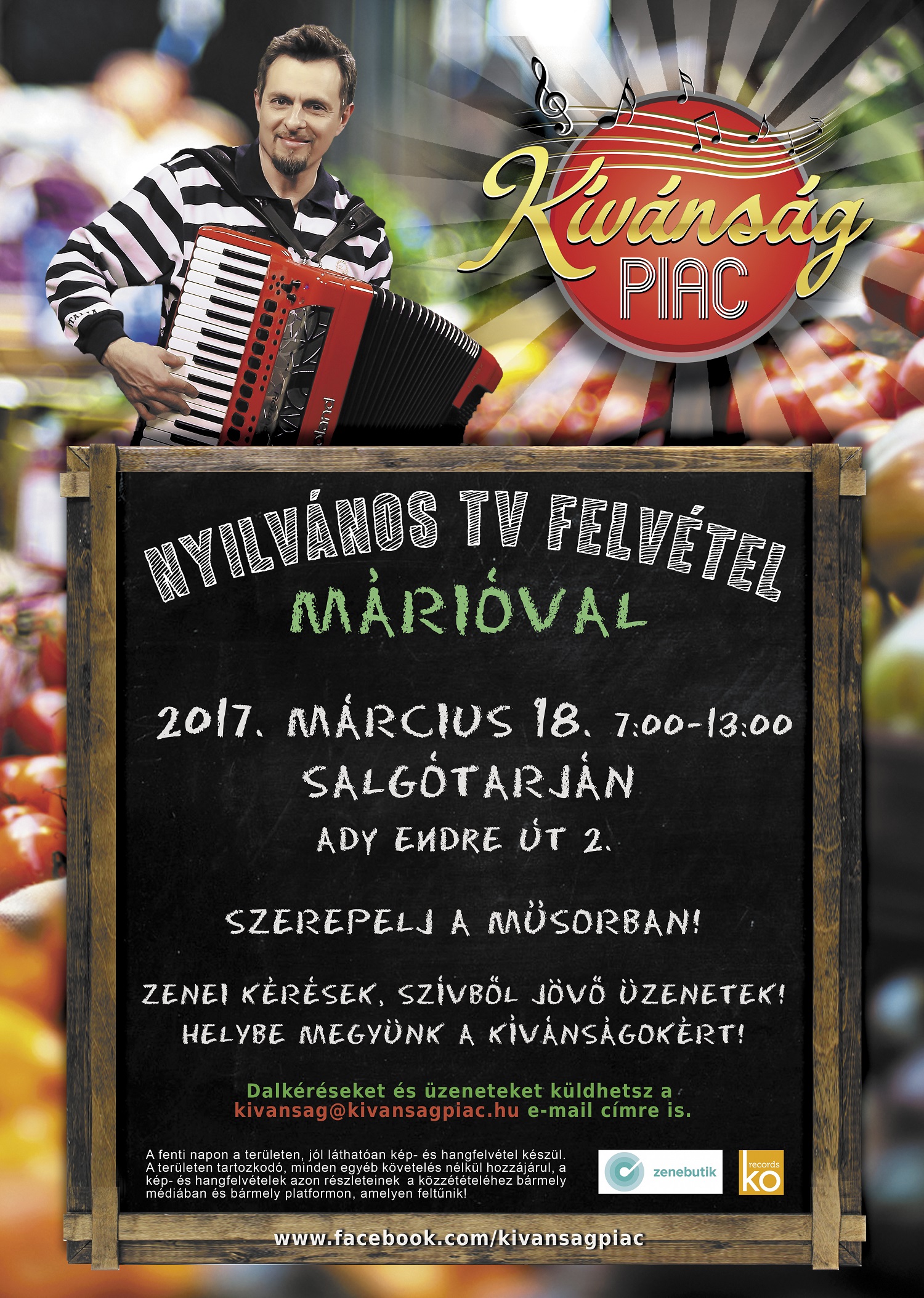 Márió műsorában adott egy nyüzsgő helyi piac, az utca embere és egy sztárvendég. A forgatások során az ország élettel teli szegleteibe látogatunk el, ahol virágzik a helyi piac vagy éppen zajlik egy hangulatos vásári forgatag. Ahol az emberek napról-napra, hétről-hétre, vagy csak ritkábban, de rendszeresen összejönnek. Ahol biztos, hogy megtaláljuk a környék legjobb gasztronómiai különlegességeit, a legharsányabb szószólóit, a legérdekesebb történeteit és persze a legkedvesebb zenei kívánságokat. A kalandos piacozások során olyan ismert, helyi kötődésű előadók, zenészek, énekesek kísérnek bennünket gondos házigazdaként, akik jól ismerik a helyi embereket, nevezetességeket, sztorikat. A műsor lényegét pedig a beszélgetések fő témája, a zene adja: zenei kívánságok, kedvenc slágerek, szívből jövő üzenetek.