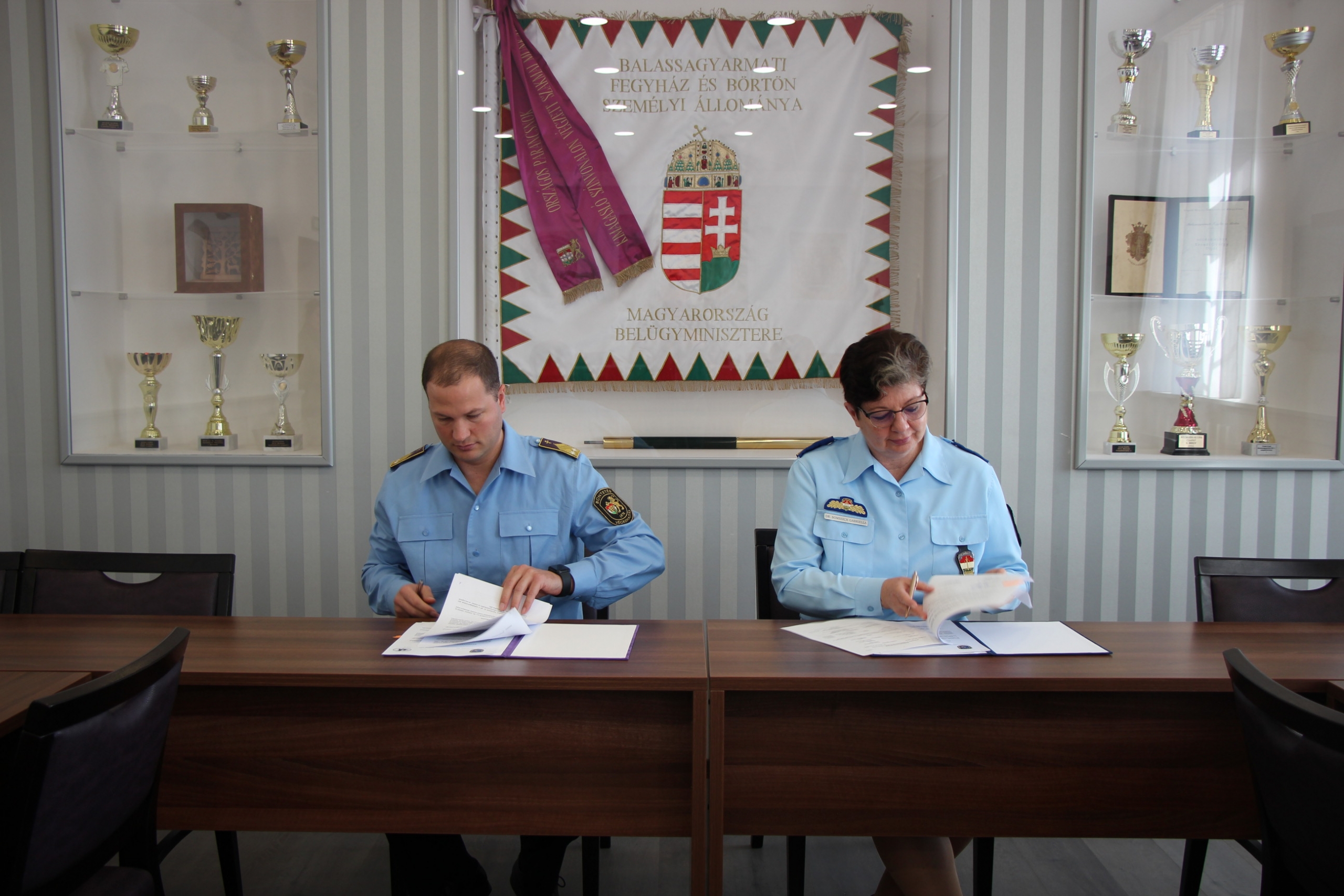 Dr. Somssich Gabriella rendőr dandártábornok, Nógrád vármegye rendőrfőkapitánya és Takács Ádám büntetés-végrehajtási alezredes a Balassagyarmati Fegyház és Börtön megbízott parancsnoka május 10-én a meglévő együttműködési megállapodások egységes szerkezetbe foglalt formáját írta alá a BV intézet falai között.
