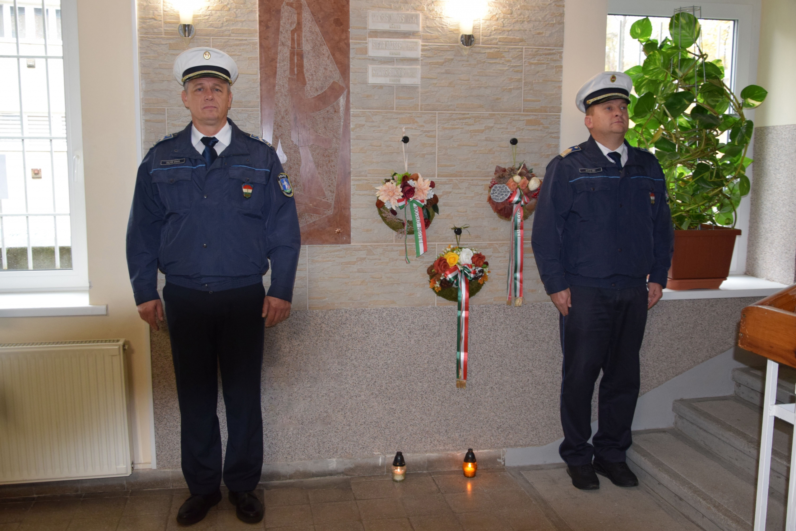 A Nógrád Vármegyei Rendőr-főkapitányságon Kocsis János határőr százados, Nyikos Sándor határőr törzsőrmester és Sipka József határőr törzsőrmester hősi halottak tiszteletére kifüggesztett emléktábla előtt rótták le kegyeletüket a rendőr-főkapitányság vezetői 2023. október 31-én.