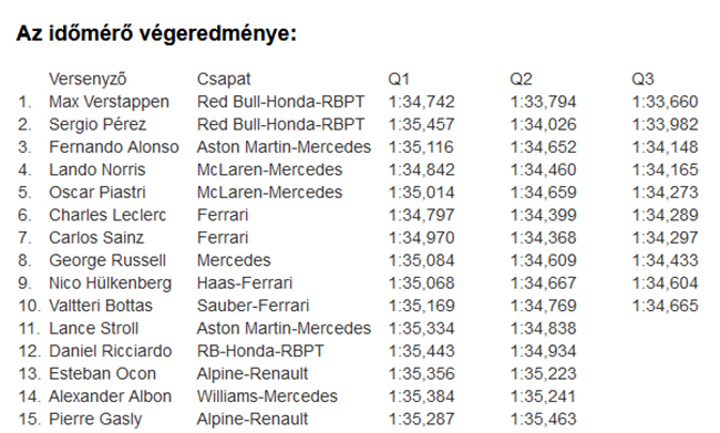 Verstappen az edzés végé sem talált legyőzőre: újabb magabiztos kört futott, amivel elhódította idei ötödik rajtelsőségét (eddig egyedül a tegnapi sprintidőmérőn tudták megállítani). A második helyre az utolsó pillanatban Pérez ugrott, harmadikként pedig Alonso zárta az időmérőt. A negyedik és az ötödik helyet a McLaren (Norris, Piastri sorrendben) a hatodik és a hetediket pedig a Ferrari (Leclerc és Sainz) pilótái foglalták el.