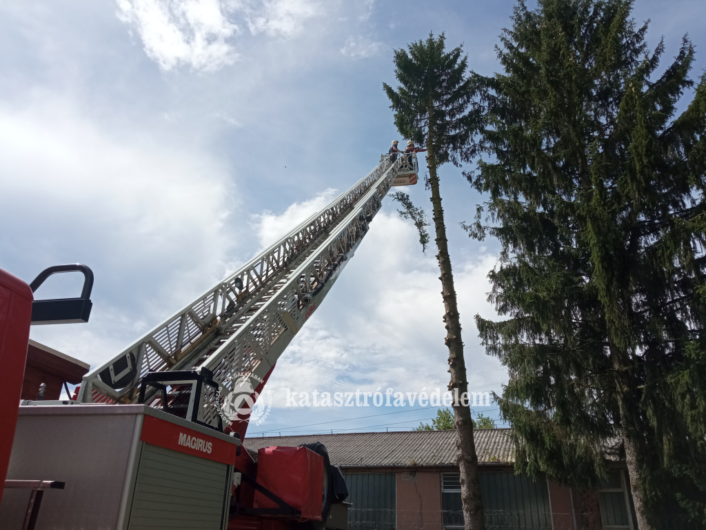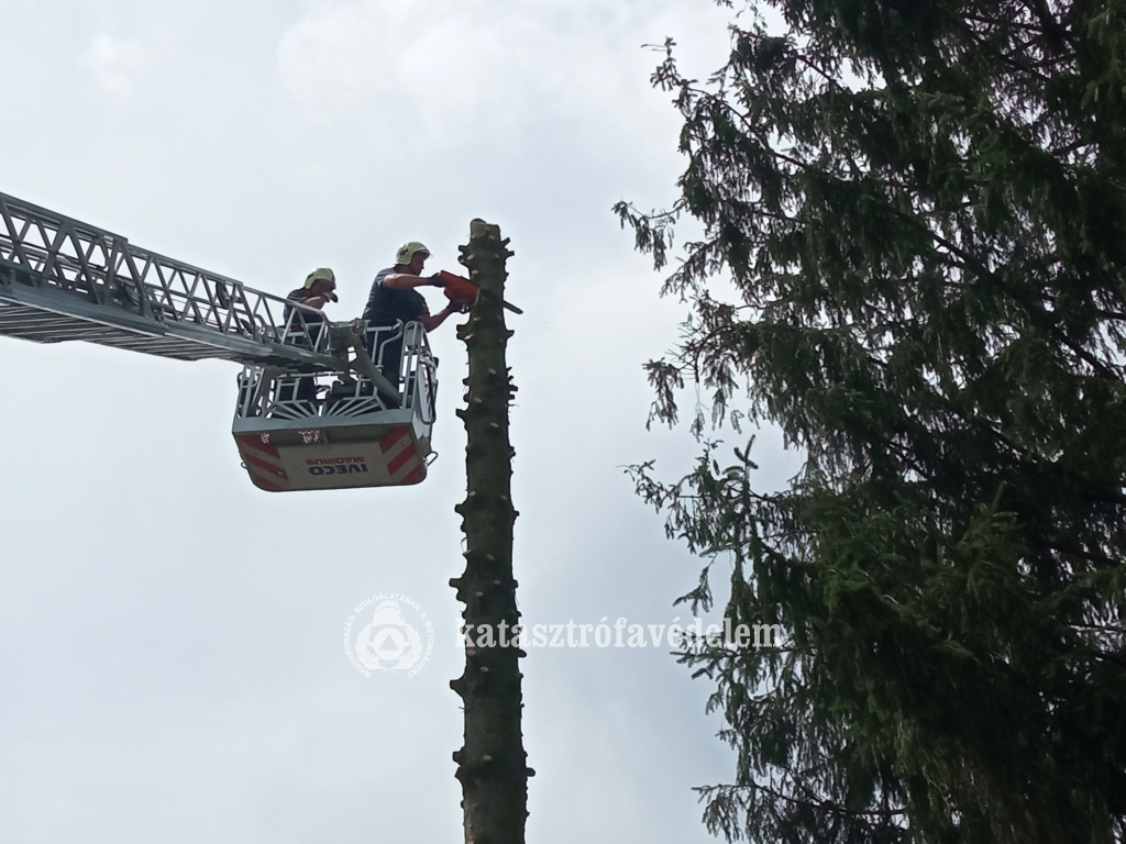 Veszélyesen megdőlt két fenyőfa szombat délelőtt Bátonyterenyén, a Kossuth Lajos úton. A fák a rendőrség épületét veszélyeztették. A helyi és a salgótarjáni hivatásos tűzoltók létraszer és motoros láncfűrész segítségével eltávolították a fákat.
