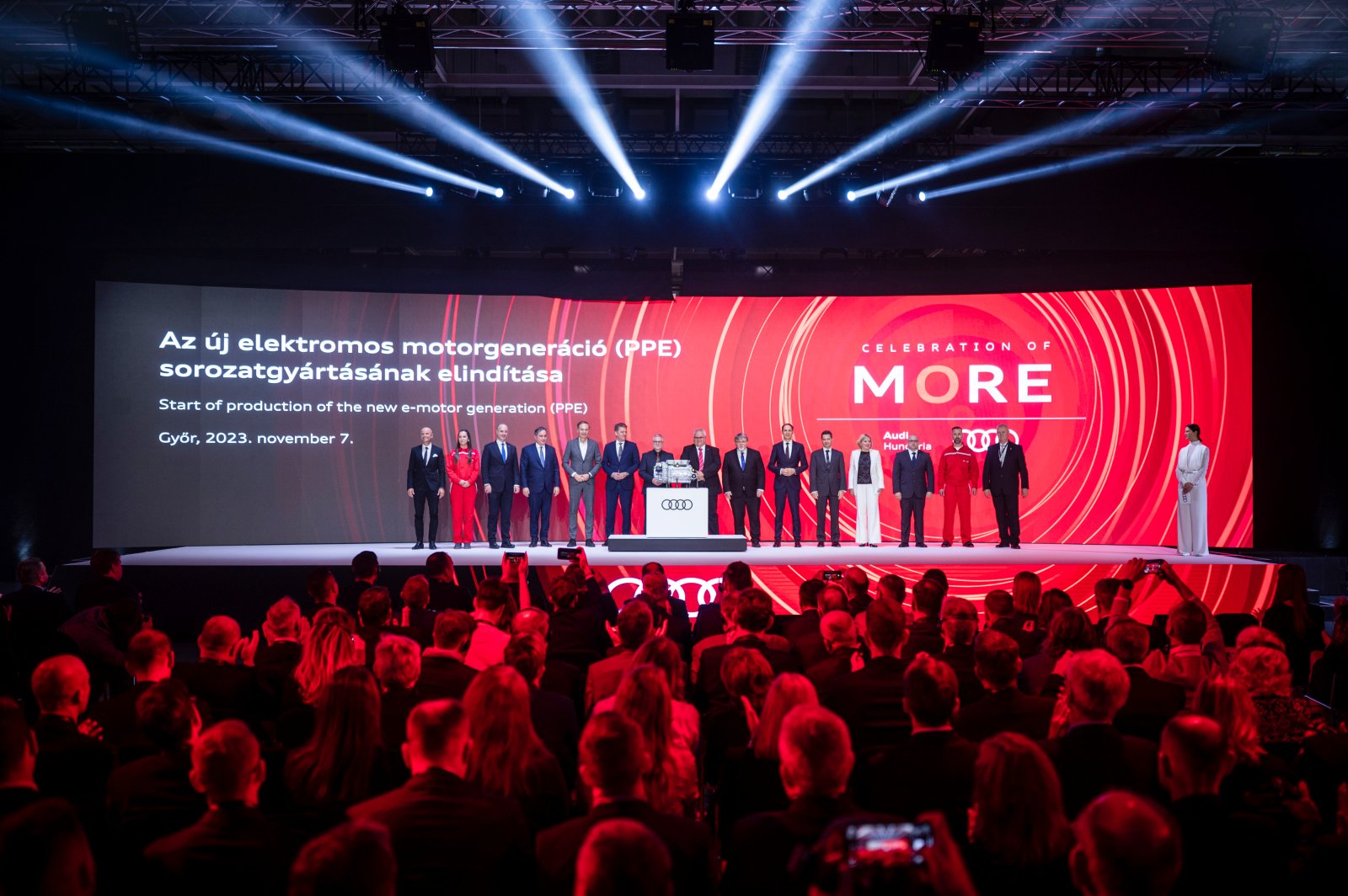 Az Audi Hungaria G10-es gyártócsarnoka felé tartunk, és már messziről érezzük, izgalmunk nem alaptalan, itt tényleg valami egészen rendkívüli van készülőben. Azt már megszokhattuk az Audi Hungariától, hogy ha valamit ünnepel, akkor azt tisztelettel teszi munkatársaival, partnereivel, vevőivel, felvonultatva a vállalatnak otthont adó Győr kulturális életének színe-javát, így a mai napon a Győri Filharmonikus Zenekar fúvósait és a világhírű Győri Balett társulatának táncosait. Volt is ok az ünneplésre, hiszen a 30 éves házigazda az elektromobilitás útján újabb jelentős mérföldkőhöz érkezett, és elindította az új generációs elektromos motorok (Premium Platform Electric, PPE) sorozatgyártását Győrben.
