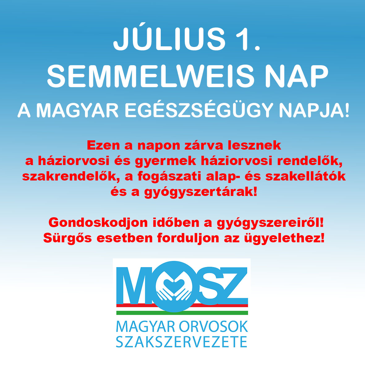 Tájékoztatásuk szerint július elseje egyben a magyar egészségügy napja, ekkor zárva lesznek a háziorvosi rendelők, a fogorvosi rendelők, a szakorvosi rendelők, a védőnői tanácsadók, a gyógyszertárak, valamint szünetel az NNGYK-ban az Anonim AIDS-szűrés Tanácsadás is. Az egészségügyi szolgáltatók a folyamatos egészségügyi ellátást július elsején az ügyeleti rend szerint biztosítják, amely vonatkozik a háziorvosi és a fekvőbeteg ellátásra is - tették hozzá.