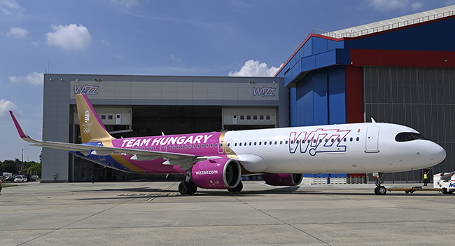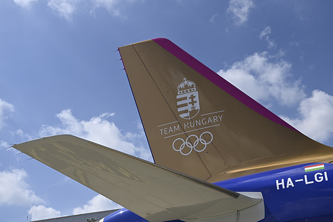 A Wizz Air légitársaság arany sávokkal díszített gépén szerepel a Team Hungary felirat, a magyar címer és az ötkarika is.