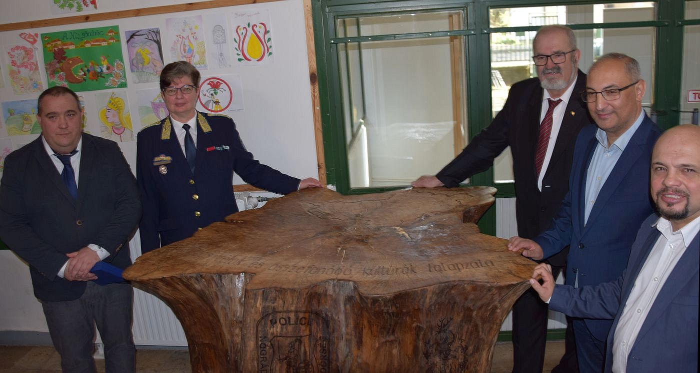 Ezt követően ünnepélyesen átadták Dancsó János asztalos atyamester által készített a „Közös célok és összefonódó kultúrák talapzata” asztalt ábrázoló szobrát, amelyet a művész egy különleges, négy fa ágainak évek alatt összenőtt törzséből készített, ezáltal az összefogást és az egymásba fonódást szimbolizálja. A műalkotás az átadás és a program helyszínének teret adó iskola auláját díszíti a jövőben. A beszédek megtartását követően a vármegyei rendőrfőkapitány Szent György emlék plakettet adományozott Dancsó János asztalos atyamester részére a felajánlott szobor elkészítéséért, továbbá a Fáy András Technikum, Gimnázium, Szakképző Iskola, Szakgimnázium igazgatója, Maruzs László részére a rendezvény szervezésében nyújtott támogatásáért.