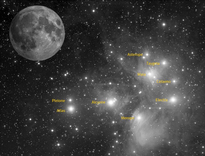 Tőle jobbra fölfelé két fokkal a Fiastyúk csillaghalmaza lesz látható. A halvány kékesfehér csillagok alkotta csillaghalmaz ködös foltként tűnik majd fel a holdsarló mellett, egy kézitávcsővel azonban kéttucat csillaga is megfigyelhető lesz.