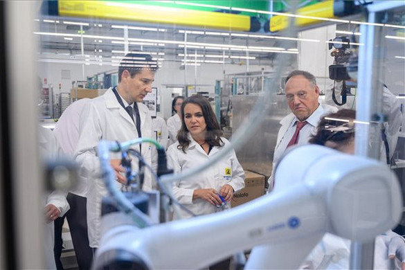 Az államfőt a településvezető mellett Sinkó Ottó és Lakatos Péter társ-vezérigazgató, valamint Klambauer Csaba, a Videoton Electronic Assembly Services (VEAS) Kft. ügyvezetője vezette körbe a cég 2019-ben átadott elektronikai szerelőcsarnokában.