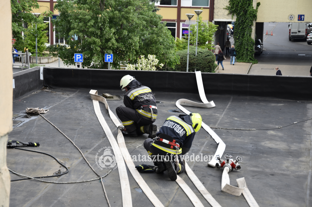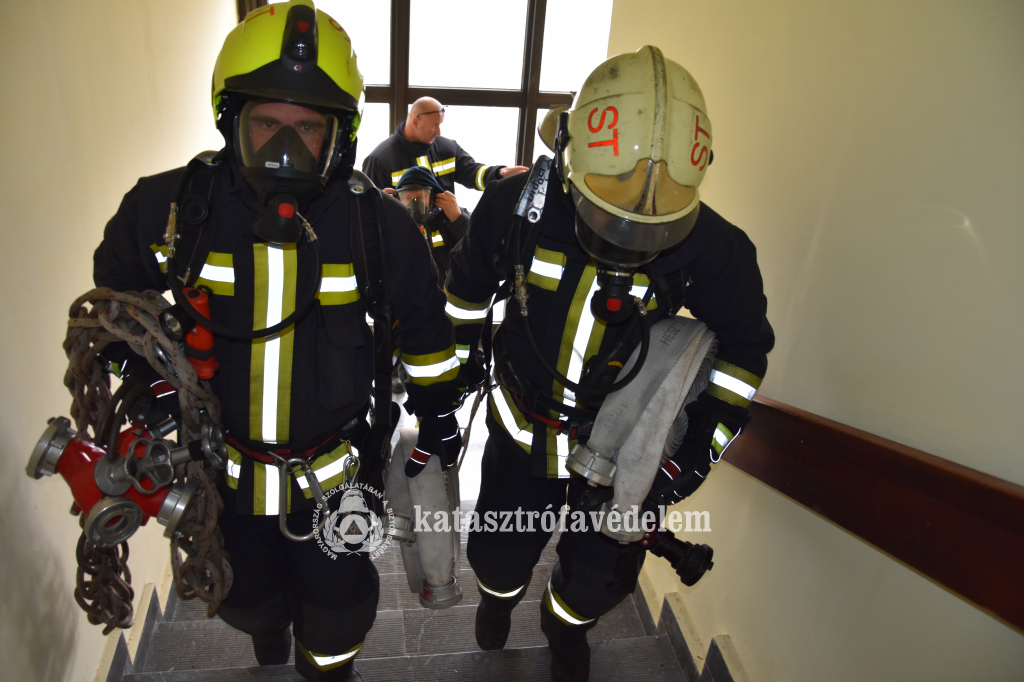 A gyakorlat helyszínére öt gépjárművel érkeztek a tűzoltók. Az egységek az épület homlokzatán húzták fel az alapvezetéket, amelyen keresztül a vizet biztosították az oltáshoz. Odabent a szervezők a tüzet piros, a füstöt kék zászlókkal imitálták. A beavatkozó állomány bevetési védőruhában és a füsttel telített helyiségekben teljes légzésvédelem mellett kezdte meg a feltételezett káreset felszámolását. A lángokat az épületen belül három vízsugárral fékezték meg. Az oltási munkálatokkal párhuzamosan a mentési csoportot alkotó tűzoltók átvizsgálták a tűz által veszélyeztetett szinteket, és magatehetetlen, sérült emberek után kutattak.