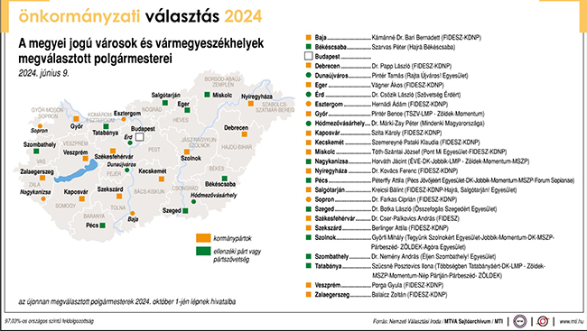 A megyei jogú városokban a Nemzeti Választási Iroda 22.00 órai adatai alapján, a szavazatok 73,21 százalékos országos szintű feldolgozottságánál az első három helyen az alábbi jelöltek állnak.