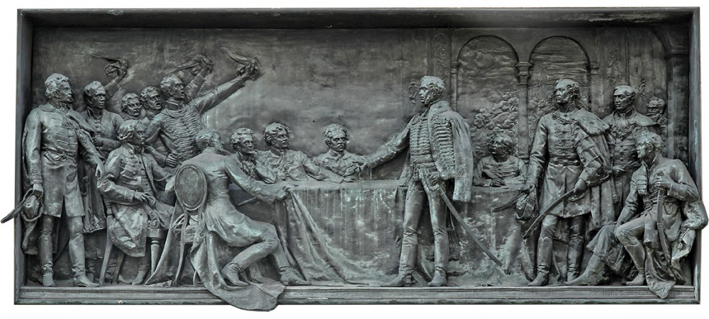 Holló Barnabásnak az alapítást ábrázoló bronz domborműve (1891-93) az MTA székházának Akadémia utcai falán - Fotó: Hámori Péter