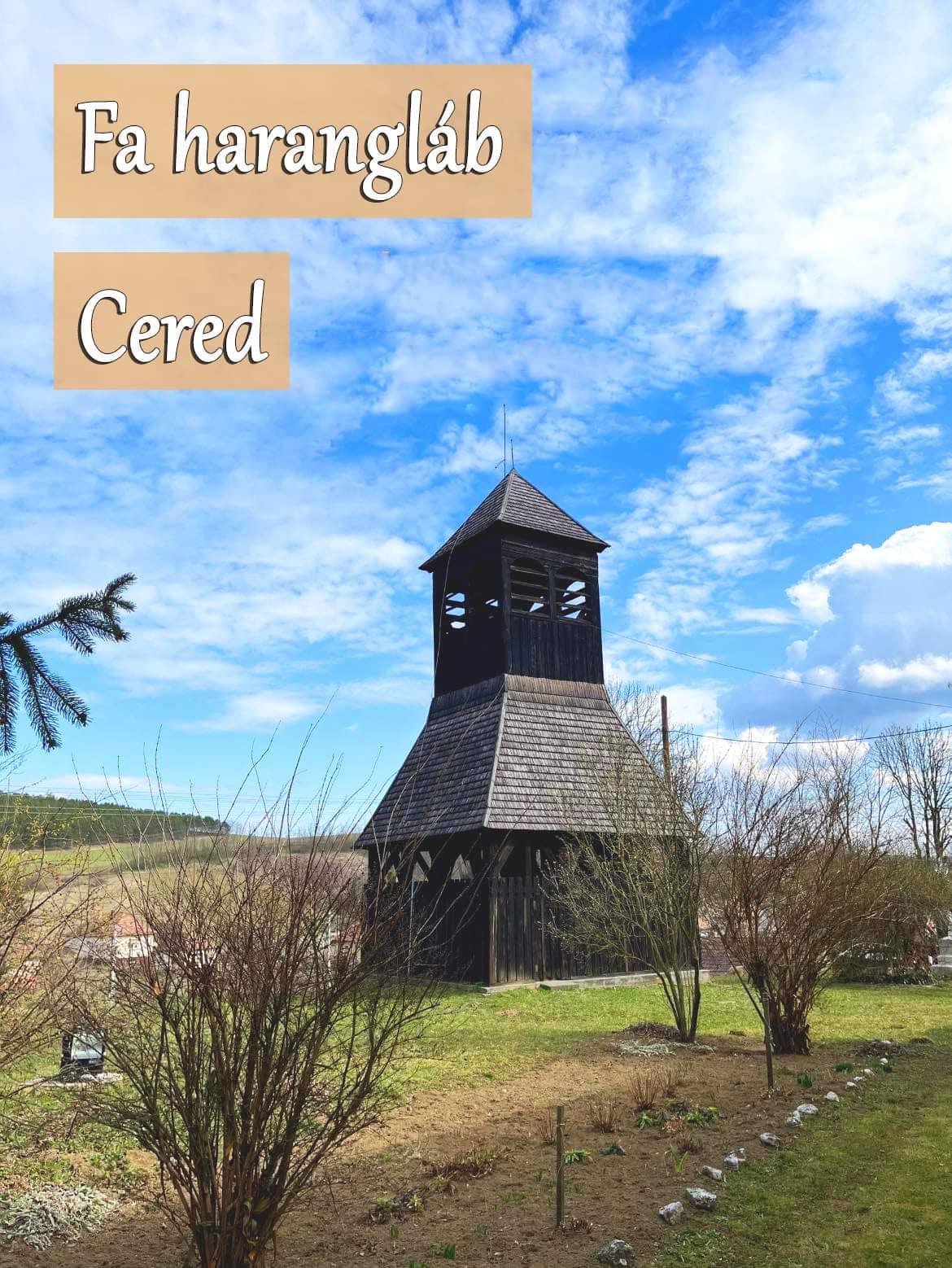 A ceredi római katolikus templom kertjében zömök, sátortetős, szoknyás faharanglábat találunk.