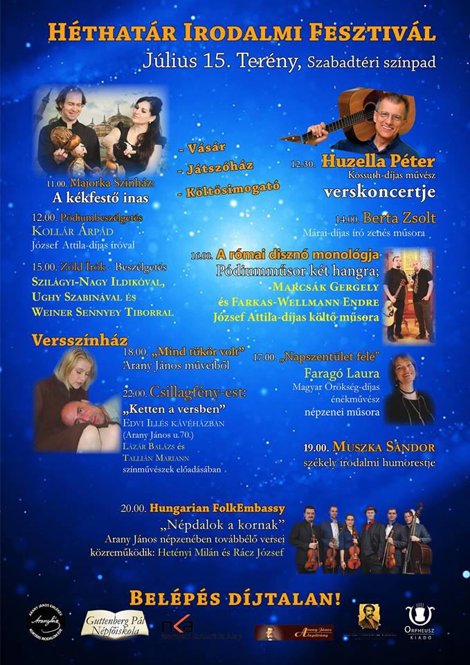 A közönség pódiumbeszélgetésen találkozhat Kollár Árpád József Attila-díjas íróval, verskoncertet ad a Kossuth-díjas Huzella Péter, Berta Zsolt Márai-díjas író pedig zenés műsorral lép fel. Az ingyenes fesztiválon a családokat is folyamatos programok várják, lesz kézműves vásár, játszóház és állatsimogató, valamint fellép a Majorka Bábszínház is.