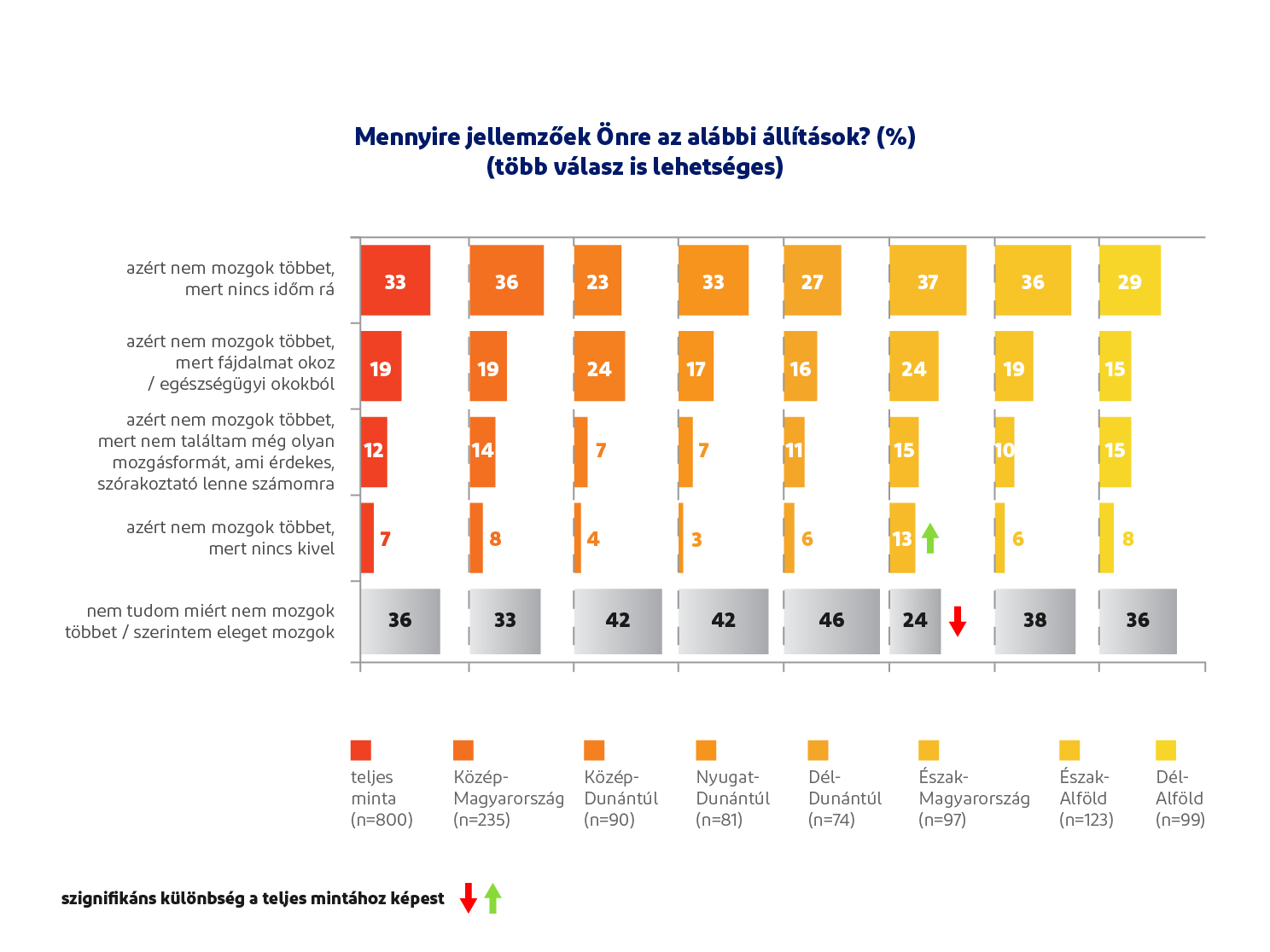Idén májusban országos, reprezentatív felmérés zajlott, amely a 30 év felettiek sportolási szokásait vizsgálta az egyes régiókban. Kiderült, hogy az Észak-Magyarországon élők az időhiány (36%) miatt nem mozognak eleget, de nagyon sokan panaszkodtak a mozgással járó fájdalomra is (24%). Az Észak-Alföldön lakók több, mint harmada szintén az időhiánnyal magyarázza, hogy keveset mozog, a mozgásszervi problémák minden ötödik embernek jelentenek gondot. Ezzel kapcsolatban Dr. Nagy Sándor, a Magyar Nyugdíjasok Országos Szövetségének szenior mozgásszakértője hozzátette: „a rendszeres mozgás a 60 év felettiek körében még ritkább, ilyenkor már nem az időhiány az, ami akadályozza a rendszeres sportot, hanem a túlsúly, a különböző betegségek, a mozgásszervi, ízületi fájdalmak. Ez egy ördögi kör, minél idősebb valaki, annál kevesebbet mozog, holott egyre inkább szüksége lenne a rendszerességre az egészség megőrzéséhez és a mozgásszervi fájdalmak megelőzéséhez.”
