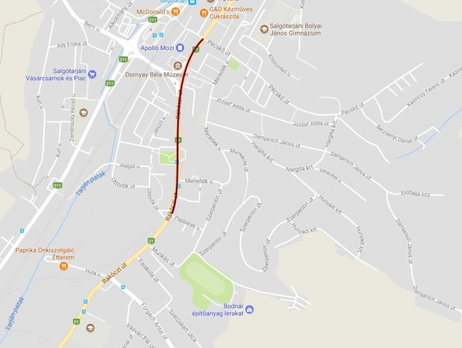 - Salgótarjánban 2017. október 23-án 8 órától 13 óra 30 percig a Rákóczi utat zárják le teljes szélességében, a Papberek úti elágazótól a Pécskő út kereszteződéséig, de a Vásárcsarnok felől érkezők kanyarodhatnak a városközpont irányába, illetve a városközpontból a Dornyai Béla Múzeum mellett a Vásárcsarnok irányába is közlekedhetnek a járművek.
