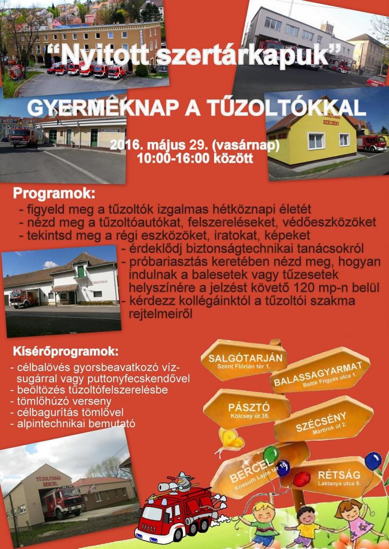 Salgótarjánban a Nógrád Megyei Katasztrófavédelmi Igazgatóság épületében található állandó kiállítást is megtekinthetik az érdeklődők, illetve itt alpintechnikai bemutató is lesz a Karancs Speciális Mentőszolgálat jóvoltából. Balassagyarmaton a laktanya udvarán található föld alatti polgári védelmi- és tűzoltómúzeumot is megtekinthetik az odalátogatók, amely egy régi légoltalmi óvópincéből lett kialakítva. Szintén Balassagyarmaton az Ipoly-völgyi Különleges Mentők speciális eszközeivel is megismerkedhetnek gyermekek és felnőttek egyaránt. A tűzoltók Salgótarjánban a Szent Flórián tér 1., Balassagyarmaton a Baltik Frigyes utca 1., Pásztón a Kölcsey út 35., Szécsényben a Mártírok út 2., Bercelen a Kossuth Lajos tér 10., míg Rétságon a Laktanya utca 9. szám alatti épületekben várják a gyermekeket és kísérőiket, sőt ez utóbbi helyszínen a Rétsági Önkéntes Tűzoltók szertárát és felszereléseit is megtekinthetik. Mind a hat helyszínen rendkívül izgalmas kísérőprogramokban is részt vehetnek a gyermekek: lehet célbalőni gyorsbevatkozó vízsugárral vagy puttonyfecskendővel, beöltözhetnek tűzoltófelszerelésbe, tömlőhúzó versenyen bizonyíthatnak, de célba is guríthatnak a tömlővel.
