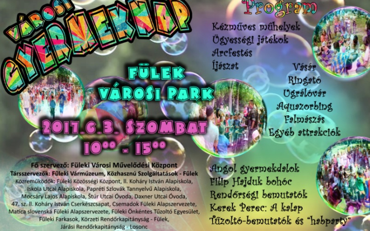 A Városi Gyermeknapon játékból, nevetésből és szórakozásból nem lesz hiány. A helyi óvodák és alapiskolák, a Közösségi Központ, a füleki cserkészcsapat, a Helen Doron Nyelviskola és a a helyi Matica slovenská Háza jóvoltából a gyerekek 16 állomáson próbálhatják ki ügyességüket és kreativitásukat, és számos versenyjátékban vehetnek részt. A déli órákban A kalap című mesejátékkal lép színpadra a Kerek Perec Egylet, majd egy zenés, interaktív előadás keretében Filip bohóc varázsolja el a gyerekeket bűvészmutatványaival. A Körzeti Rendőrkapitányság jóvoltából alkalom nyílik a látogatók számára, hogy közelebbről megtekintsék a rendőrségi fegyvereket, kipróbálják a rendőrautót, majd részt vegyenek egy kutyakiképző bemutatón, melyet a Losonci Járási Rendőrkapitányság rendőrei mutatnak be. A Füleki Önkéntes Tűzoltó Egyesület is izgalmas programmal készült, amely során a résztvevők szemtanúi lehetnek valódi tűzoltásnak, megnézhetik közelről a tűzoltóautót illetve annak felszerelését. A rendezvény záró programja a „habparty”, melyet a tűzoltók kifejezetten a gyerekek számukra készítenek. Az egész napos program kísérőrendezvényei közül a legapróbbak és szüleik részt vehetnek a Csemadok Füleki Alapszervezete Ringató foglalkozásán, a nagyobbak megtanulhatják az íjaszat alapjait a Füleki Farkasok segítségével, illetve motorozhatnak a Filleck Knights motoros csapat jóvoltából. Nem hiányozhat a kézzel hajtott körhinta, az ugrálóvár, az aquazorbing, a falmászás valamint az arcfestés sem. A parkban az árusok is helyet kapnak, akik gyermekjátékokat, lufikat illetve cukorvattát – a szülők és kísérők részére frissítőt – kínálnak majd. A rendezvény fő szervezője a Füleki Városi Művelődési Központ, társszervezői a Füleki Vármúzeum és a Füleki Közhasznú Szolgáltatások. Támogatók: TV LocAll, Fagylalt – Ferenczová Andrea és a Helen Doron Nyelviskola.