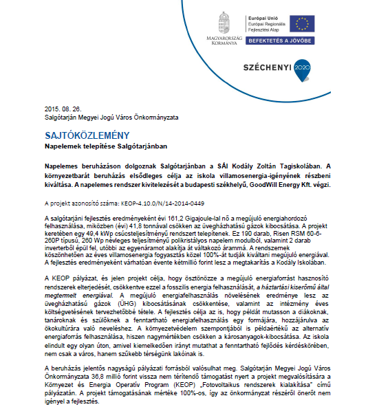 Napelem projekt galéria 2015 Kodály Zoltán Általános Iskola
