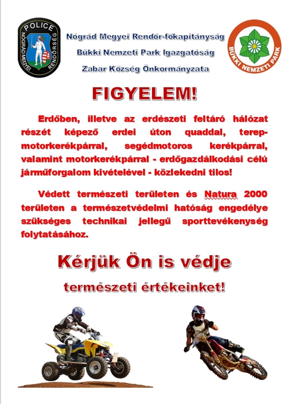 A Nógrád Megyei Rendőr-főkapitányság, a Bükki Nemzeti Park Igazgatósága, a Nógrád Megyei Polgárőr Szervezetek Szövetsége és Salgótarján Megyei Jogú Város és Cered, Bárna, Zabar Községi Önkormányzat közösen lépnek fel a természetvédelmi területeken engedély nélkül quadokkal és motorokkal közlekedők ellen. Ennek érdekében 2020. júliusban munkacsoport alakult meg, amelynek elsődleges célja a Nógrád megyében található természetvédelmi és különösen védett természetvédelmi területek, valamint a Natura 2000-es természetvédelmi területeken található természeti kincsek megóvása.