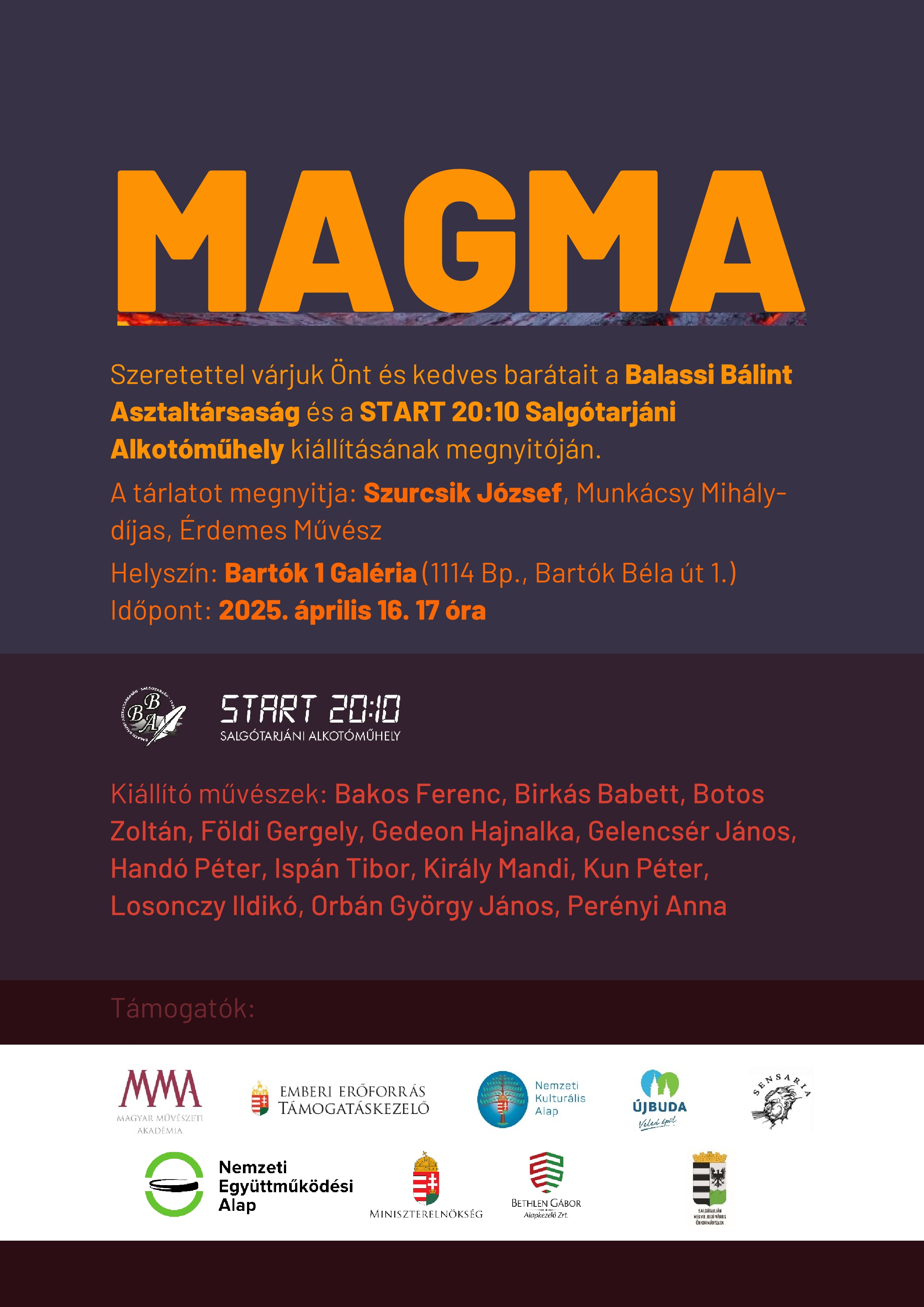 A MAGMA kiállítás anyagát a Balassi Bálint Asztaltársaság és a StArt 20:10 Alkotóműhely tagjai Bakos Ferenc, Birkás Babett, Botos Zoltán, Földi Gergely, Gedeon Hajnalka, Gelencsér János, Handó Péter, Ispán Tibor, Király Mandi, Kun Péter, Losonczi Ildikó, Orbán György János, Perényi Anna műveiből állították össze a projekt kurátorai.
