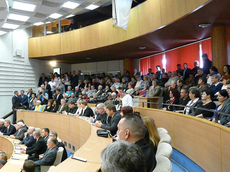 Az ünnepi közgyűlésre zsúfolásig megtelt a Városháza Förster Kálmán Terme, ahol a résztvevők között helyet foglalt dr. Hiller István, a Magyar Országgyűlés alelnöke és dr. Szabó Sándor kormánymegbízott, a Nógrád Megyei Kormányhivatal vezetője is.