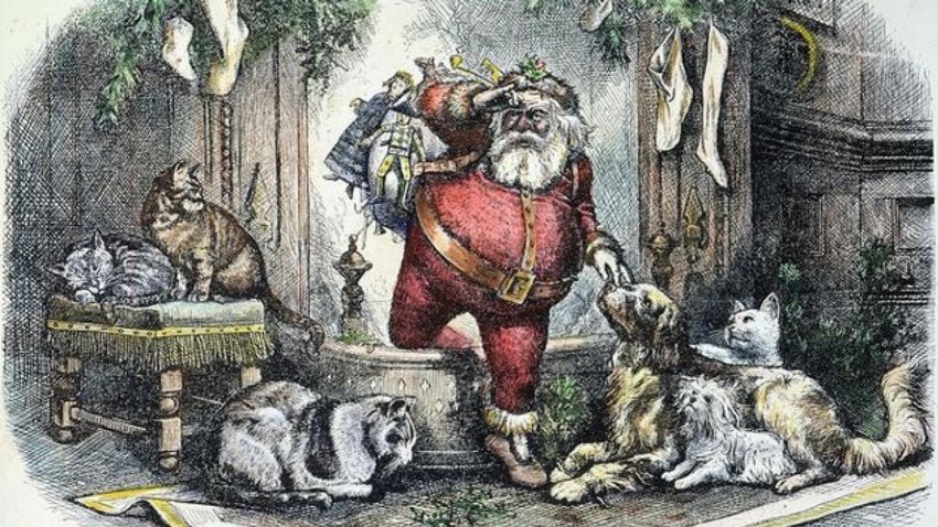 Thomas Nast karikaturista által készített illusztrációkban először jelent meg a jól ismert, kövér, piros ruhába öltözött Télapó.