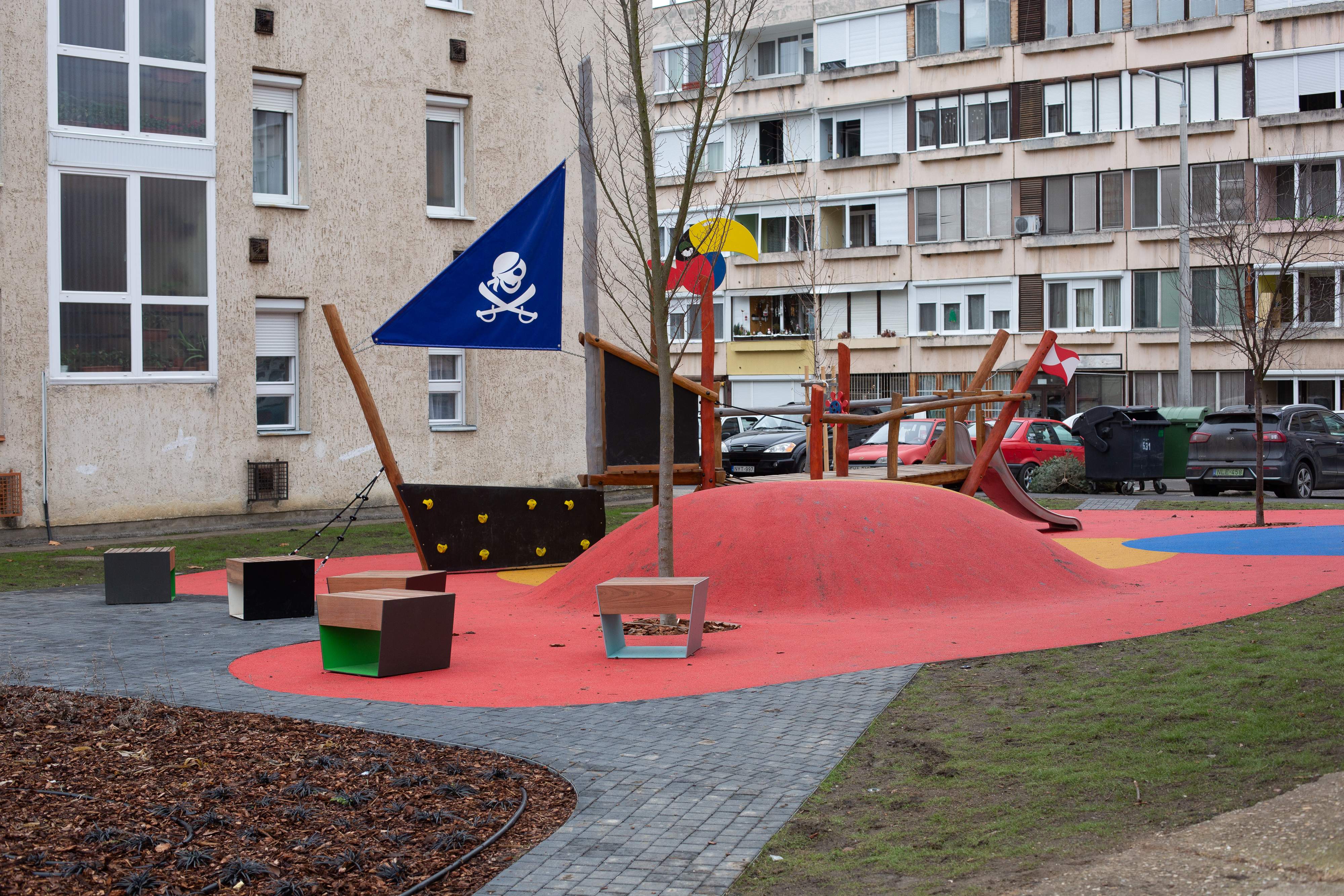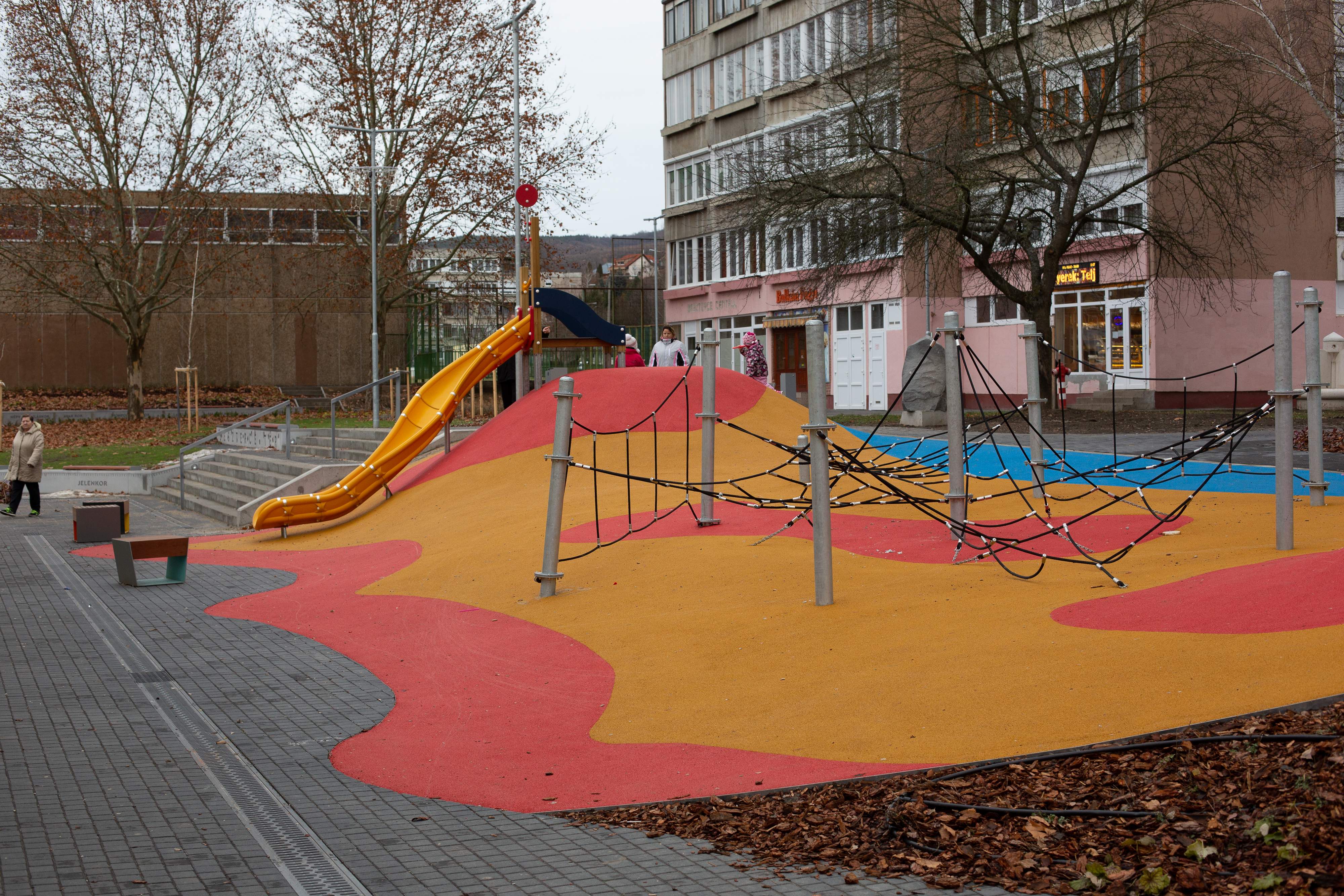 A házak között megszüntetett játszótereket pótolva két helyen kerültek telepítésre játszóeszközök, melyek növényzettel egészülnek ki. Színes gumiburkolatú, modern megjelenésű, izgalmas játszóterek várják a lakótelep és a város kisgyermekeit. Kialakításra került egy kisebb kültéri fitneszpark is két pingpongasztallal, melyeket szintén színes gumiburkolat vesz körbe. Különleges elemként jelenik meg a téren és a Gyermekkert sétányon a Novohrád-Nógrád Geopark tematikájára építő városi tanösvény. Az egyedileg tervezett interaktív tanösvényen a bemutatott geológiai és biológiai információk a városi környezethez és a köztéri helyzethez adaptált formában jelennek meg. A tér különböző bútorainak, támfalainak és burkolati szakaszainak bevonásával egyedileg megmunkált interaktív felületek jöttek létre: ezen felületek láncolata játékos formában mutatja be a természeti környezet régióra jellemző sajátosságait. Különválnak a kőzeteket bemutató, a terület élővilágáról szóló, illetve a Salgótarján környékén talált kövületek, fosszíliákat, régészeti leleteket bemutató elemek, három egymástól független hálózatot alkotva. A téren igényes, új padok, szemetesek, kerékpártárolók kerültek kihelyezésre, megújult a közvilágítás, új ivókút került a térre, valamint új fák, cserjék és évelő növények kerültek telepítésre, melyeket a projektben kialakított locsolórendszer lát majd el.