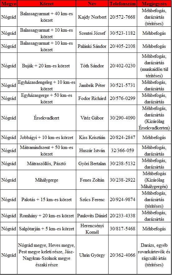 Amennyiben a rovarok közvetlenül a lakóhelyünk mellett telepedtek meg, illetve olyan helyen tartózkodnak, hogy emberekkel való érintkezésük elkerülhetetlen, ne kíséreljük meg házilagos módszerekkel eltávolítani a fészket és a rovarokat, hanem hívjunk szakértő segítséget. A Nógrád megyében ilyen tevékenységet ellátó szakemberek listája az elérhetőségeikkel együtt az alábbi táblázatban megtalálható: