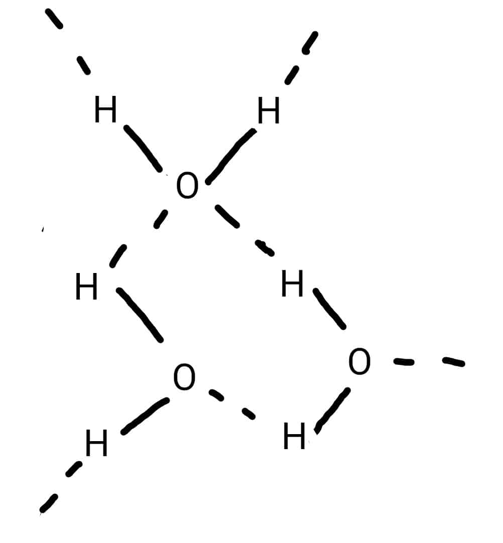 Ez történik a vízben - mutatom:a szaggatott vonal a H-híd kölcsönhatás, a folytonos vonal: molekulán belüli kovalens kötés.