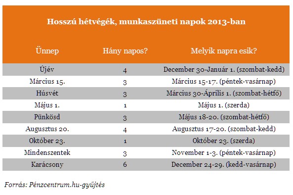 A 2013-ban még hátralevő munkaszüneti napok körüli - a naptár szerinti munkarendtől való eltéréssel járó - munkarend a következő: