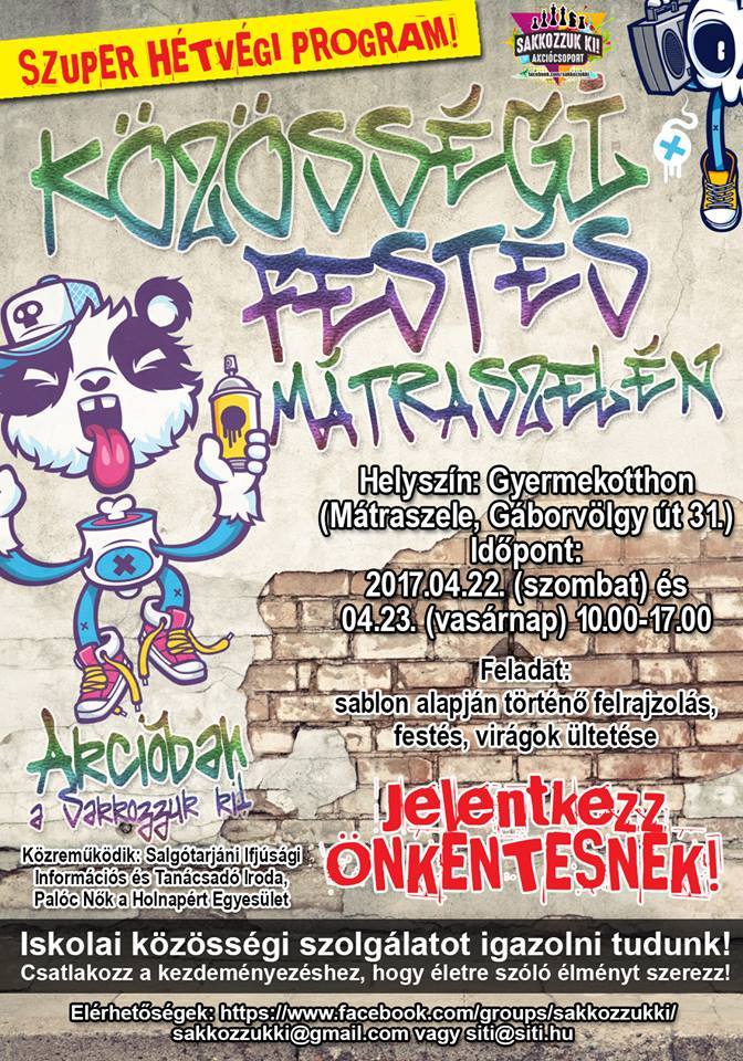 A húsvétot követő hétvégére már programajánlatuk is van a segíteni vágyó önkéntesek számára. Április 22. és 23. között a Mátraszelén működő gyermekotthon részleges megszépítésébe kezdenek, a közösségi festéshez várják a „segítő kezek” jelentkezését.