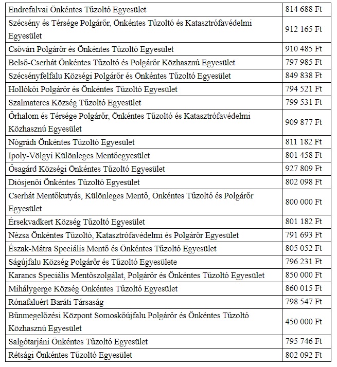 Bátonyterenyei Települési Mentőcsoport, Észak-Mátra Speciális Mentő és Önkéntes Tűzoltó Egyesület 376.047 Ft technikai eszközre és gépjárműre