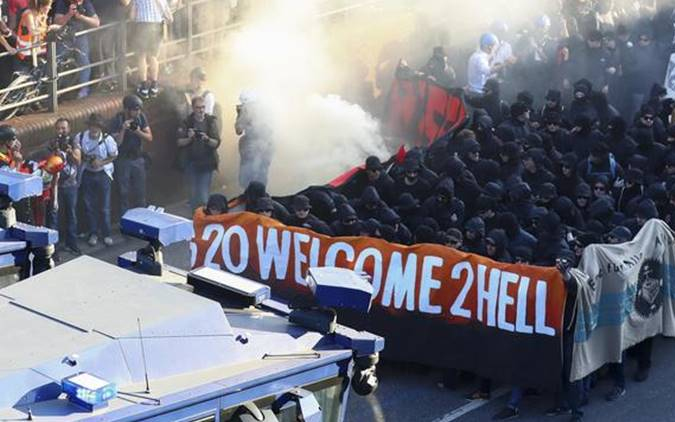 Helyszíni beszámolók szerint a tanácskozás helyszíne körüli városrészekben - St. Pauliban, Sternschanzében - helyenként nehezen áttekinthető helyzet alakult ki. A békés demonstrálók és nézelődők között elvegyülő szélsőbaloldali aktivisták kövekkel, palackokkal dobálják és tüzijáték-rakétákkal támadják a rendőröket, épületek felújításához használt állványokból és hulladékból barikádokat emelnek és gyújtogatnak.