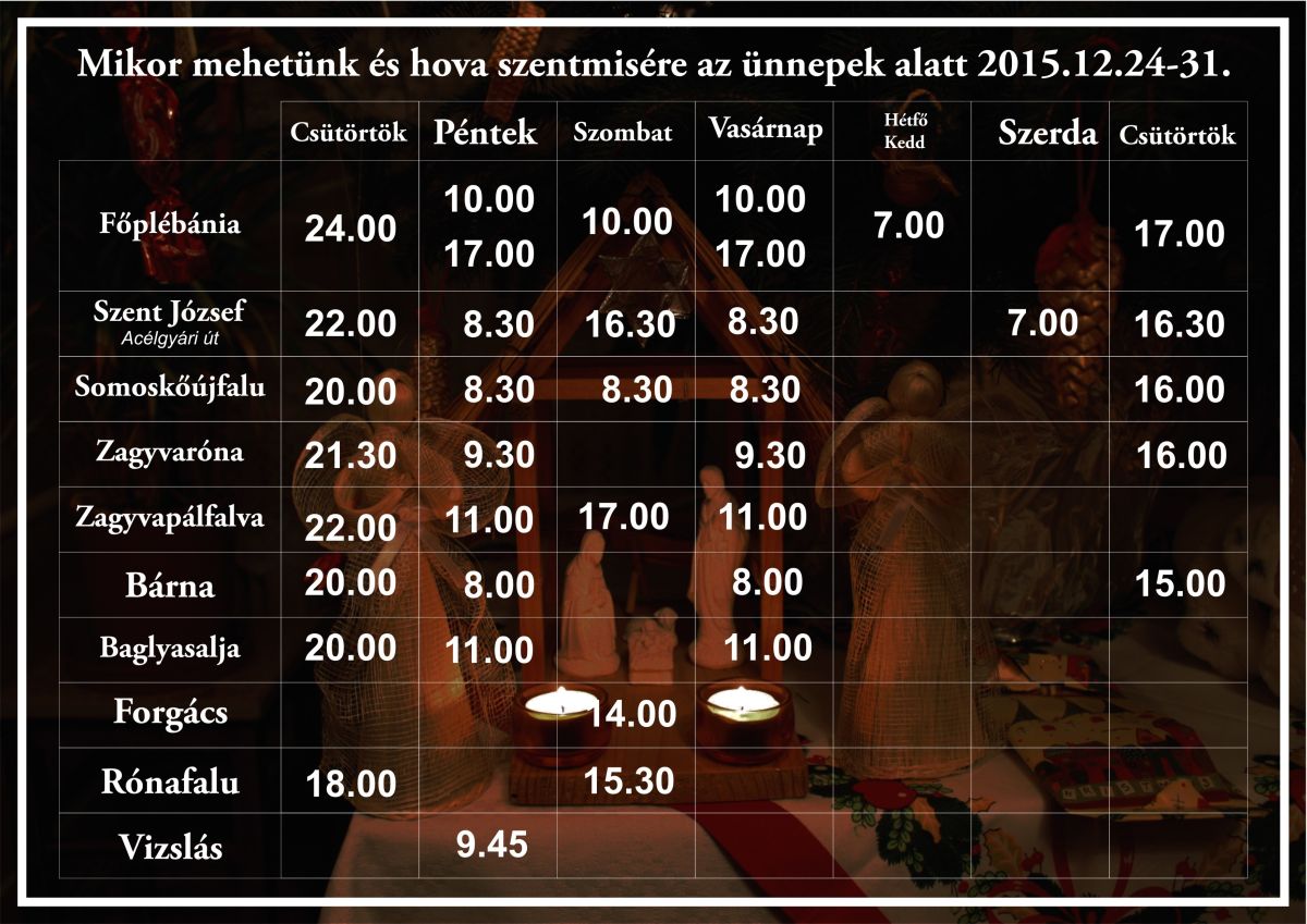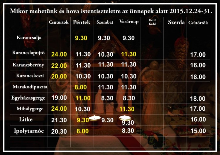 A Salgótarjáni Egyházközségek honlapján közzétették az ünnepi miserendet Salgótarján (és városrészei), Bárna, Egyházasgerge, Ipolytarnóc, Karancsalja, Karancsberény, Karancskeszi (és Marakodipuszta), Karancslapujtő, Litke, Mihálygerg